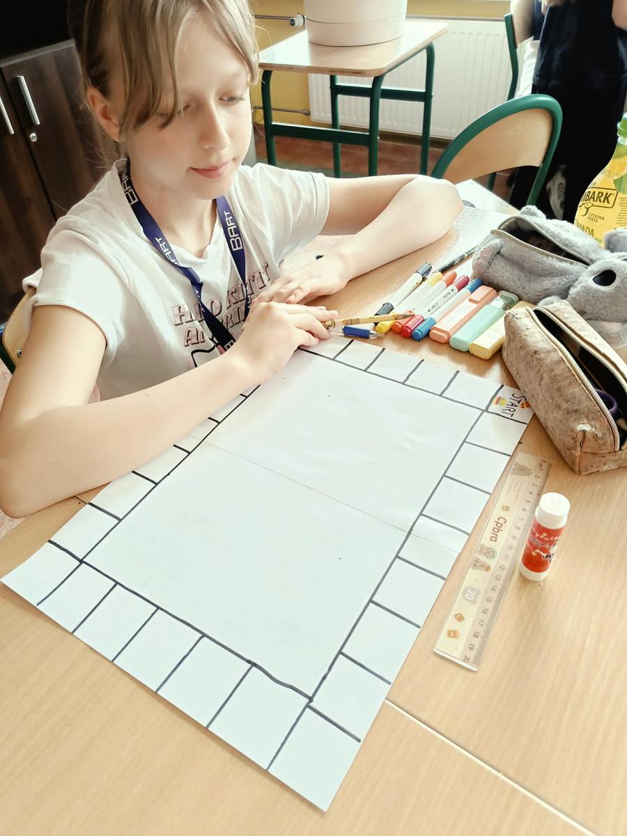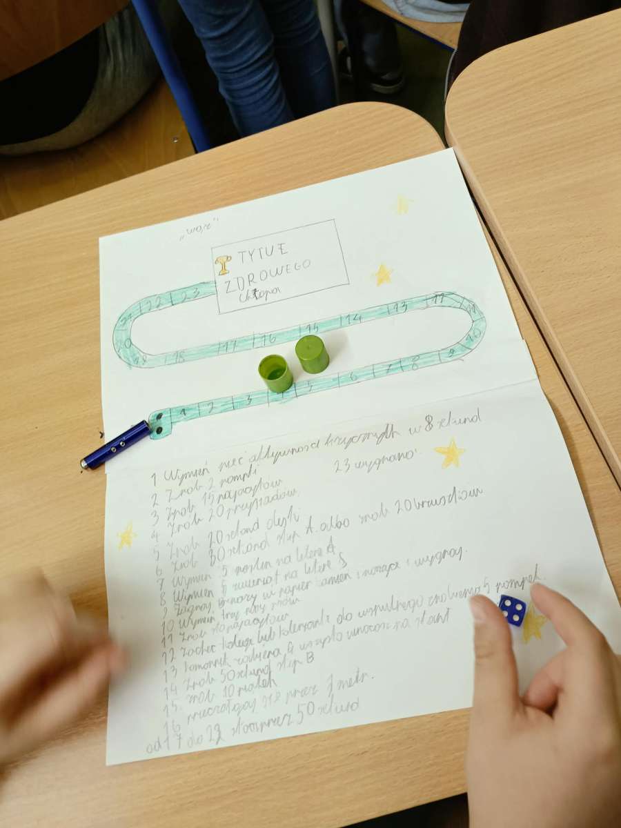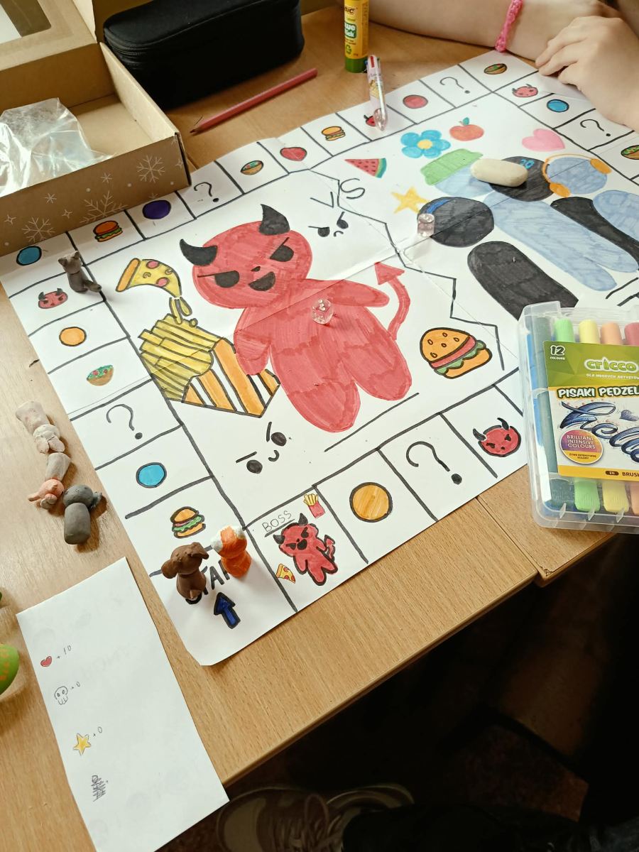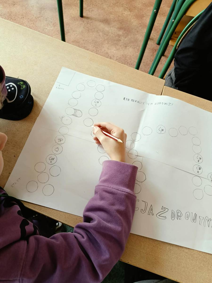 Uczniowie klas 4a, 4b i 4d podczas lekcji edukacji zdrowotnej tworzyli własne gry planszowe o tematyce zdrowia. W swoich projektach poruszali zagadnienia związane ze zdrowym stylem życia, prawidłowym odżywianiem oraz aktywnością fizyczną. Praca była okazją do rozwijania kreatywności i utrwalania wiedzy w ciekawy, angażujący sposób.