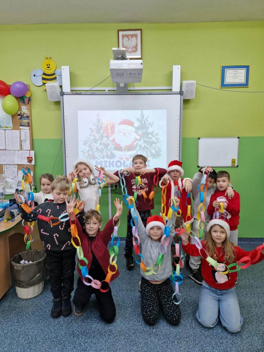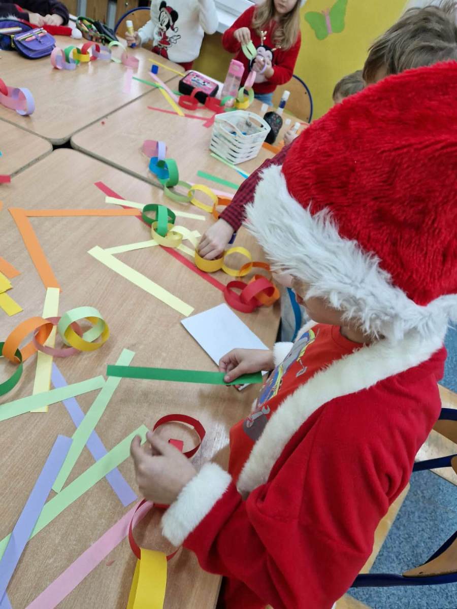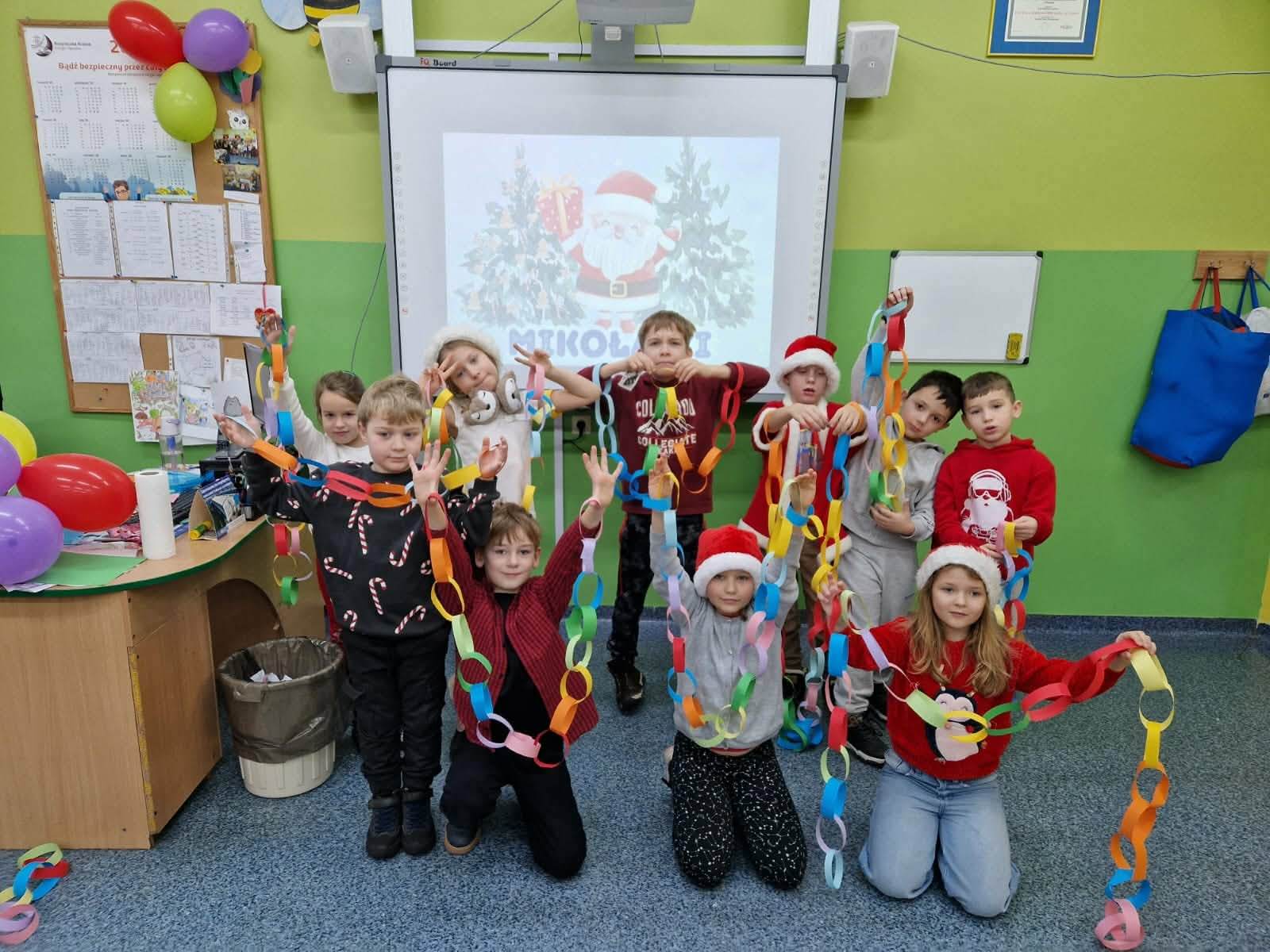 Mikołajki w naszej świetlicy upłynęły w radosnej, świątecznej atmosferze. Uczniowie wzięli udział w wielu kreatywnych i pełnych zabawy aktywnościach. Zorganizowaliśmy konkurs na najdłuższy świąteczny łańcuch, który dostarczył dzieciom mnóstwo emocji. Nie zabrakło również twórczych prac plastycznych, tym razem wykonywanych przy użyciu gąbek, co pozwoliło najmłodszym eksperymentować z kolorami i fakturami. Na zakończenie wszyscy dali się porwać rytmom świątecznej zumby, która wypełniła świetlicę energią i uśmiechem. To był dzień pełen radości, kreatywności i przedświątecznej magii!