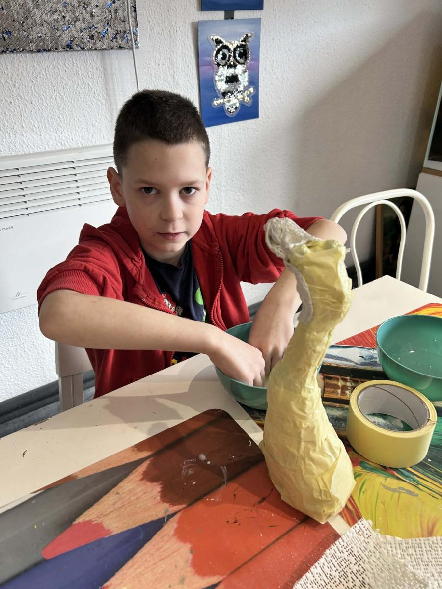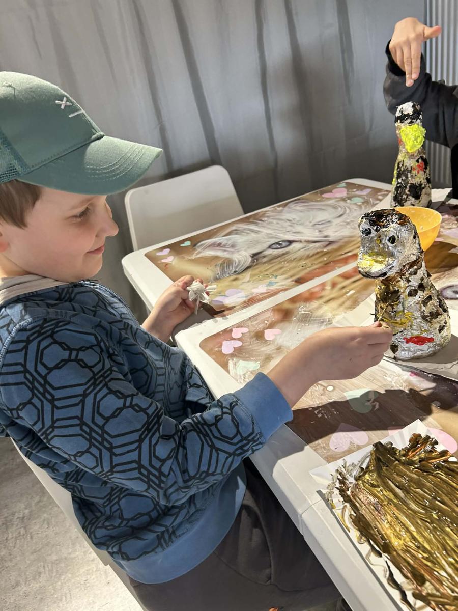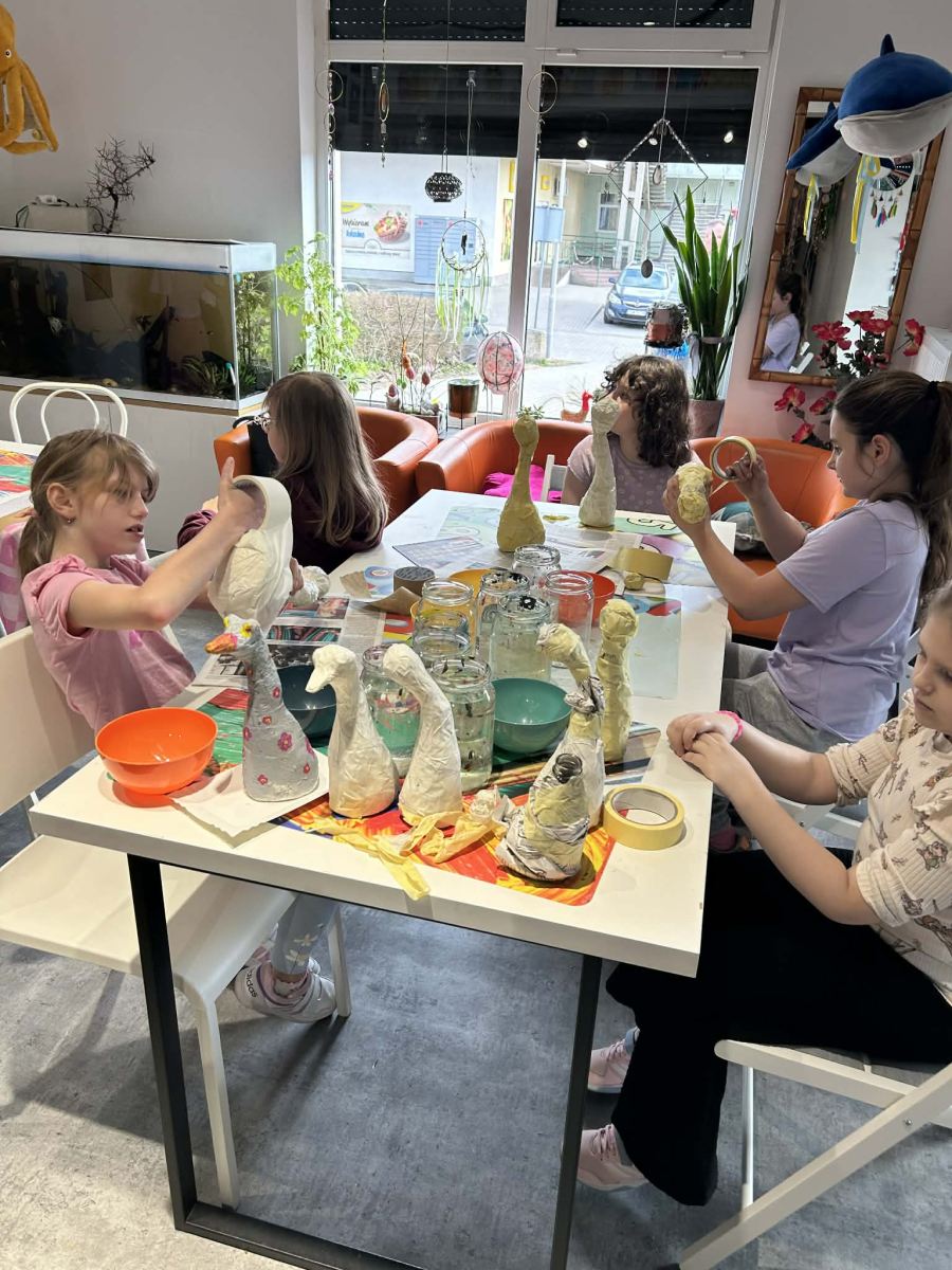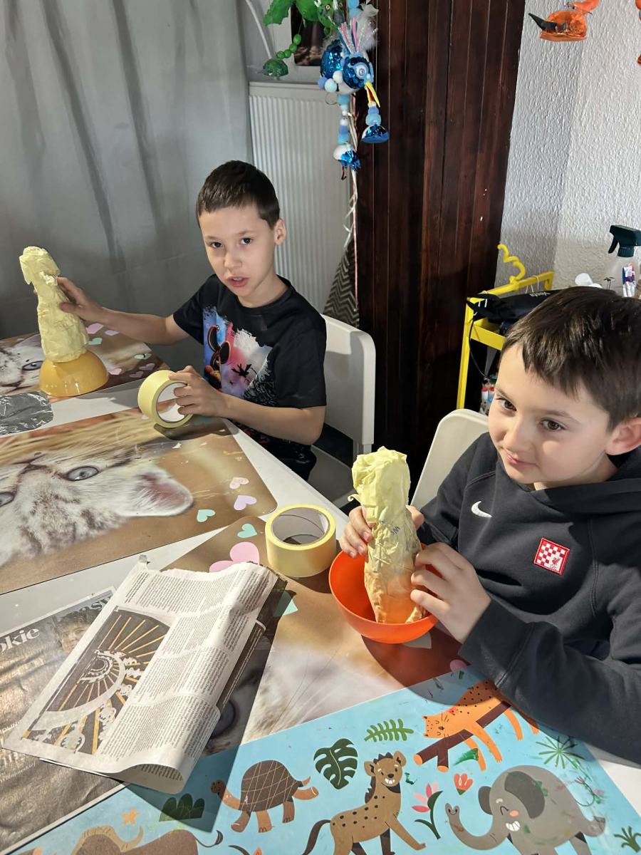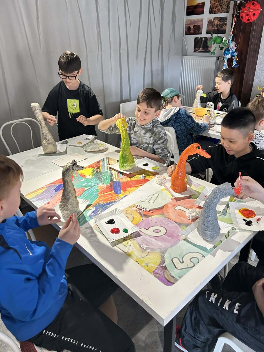 Uczniowie klasy 3b wzięli udział w warsztatach plastyczno-technicznych w pracowni artystycznej Kota Fefrota w Świeciu. Podczas zajęć rozwijali kreatywność i zdolności manualne, tworząc z gipsu „szalonego kurczaka”, a następnie ozdabiając go według własnych pomysłów. Powstały wyjątkowe, niepowtarzalne prace, a całe spotkanie przebiegło w radosnej atmosferze.